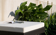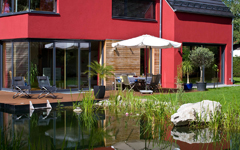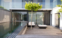 Der Wohnbereich öffnet sich hier zu einem exklusiv gestalteten Patio. Die dachförmig gezogene Platane wird sich zu einem natĂŒrlichen Schattenspender entwickeln. Die reduzierte Formensprache wurde auch in den Detaillösungen durchgehalten.